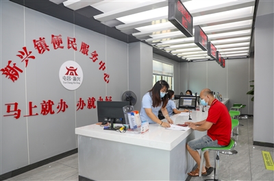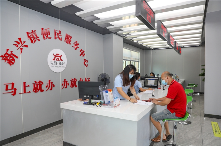 7月13日,在屯昌县新兴镇便民服务中心,工作人员正在为群众办理业务。该服务中心设置了10个服务窗口,围绕解决服务群众“最后一公里”的问题,制定实施审批代办员代办、群众“最多跑一次”等制度,周六半天不打烊,以满足群众错峰办事需求。