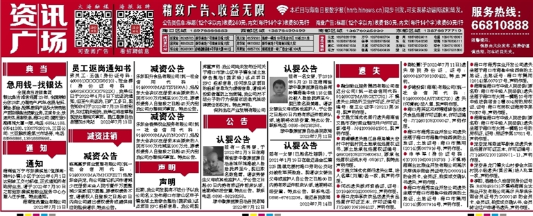 ●陈松蔓(于2022年7月11日)遗失居民身份证,证号:460004197301060422,特此声明。