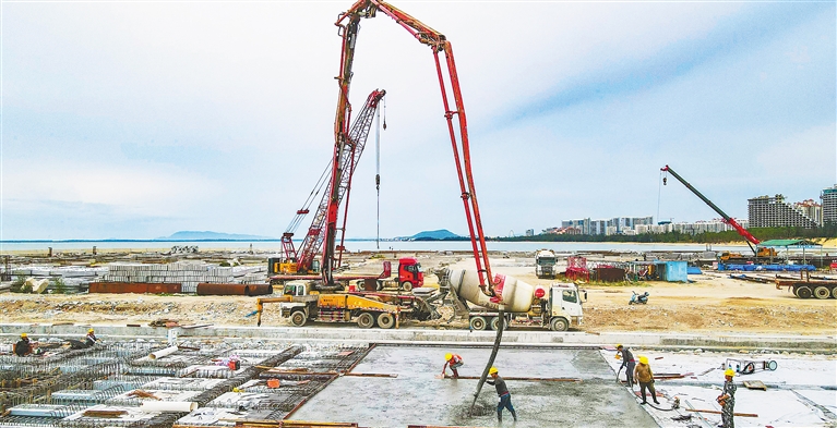 7月9日,在东方市八所中心渔港升级改造+渔业风情街PPP项目现场,工人有序施工,升级改造后的崭新渔港基本成型。目前项目总体投资已完成近一半。