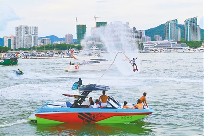 近日,在三亚河入海口,游客体验水上运动的刺激和快乐。