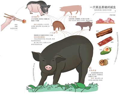 这里需要澄清一个事实:海南黑猪不等于海南本地土猪(包括海南猪、五指山猪和墩头猪)。海南黑猪,是由海南猪和外地公猪,如杜洛克猪、长白猪等,通过不断杂交、培育而成的第二代或第三代猪,全身黑色,既保留了海南猪的肉质韧、肉香等优点,又吸收了外地猪生长速度快、瘦肉率高等长处。