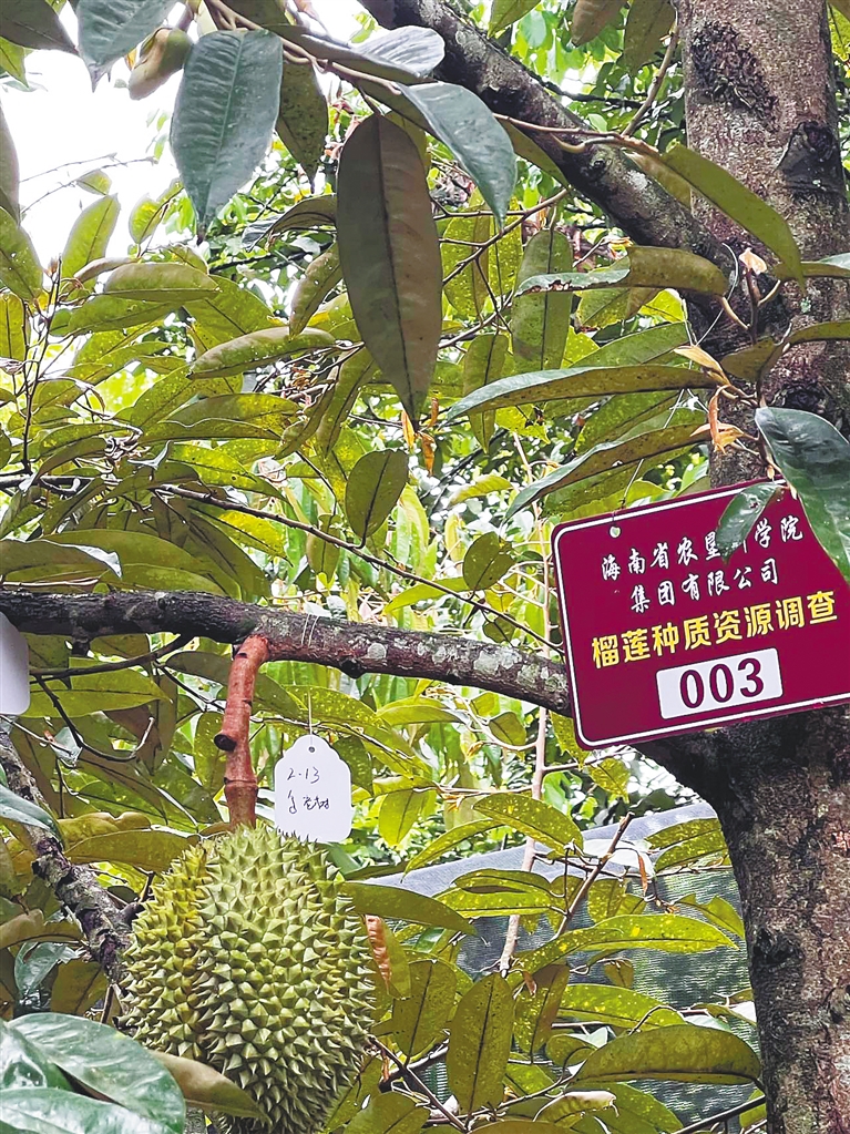 “抬头看看,叶子里是什么?”顺着海南省农垦科学院集团有限公司(以下简称农垦科学院)副总经理、研究员崔志富的指引抬头望,茂密的叶片里赫然“藏着”几个榴莲果。它们个头虽不大,但浑身布满了尖刺,在这朴素的园子显得很特别。