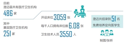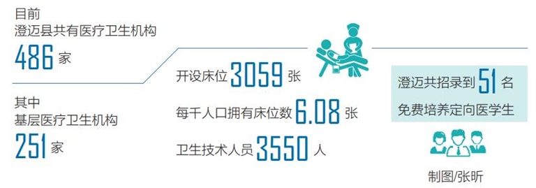 从背着药箱穿街走巷的“赤脚医生”到免费培养定向医学生为基层医疗卫生机构输送“新鲜血液”,从早期群众看病的老三样“听诊器、血压计、体温表”,到大三件(DR、彩色多普勒超声、全自动生化分析仪)、小三件(全自动血液细胞分析仪、全自动尿液分析仪、十二导联心电图机)……近年来,澄迈不断构建种类齐全、功能完善、结构合理的基层医疗网络,把优质医疗服务送到村民家门口,让群众看病更快捷、住院更省心。