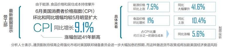 在连续3个月超过8%以后,CPI同比涨幅“破九”再次突破市场预期。不少美国媒体和经济学家将通胀高企归咎于白宫和美联储错判形势,推行过度的财政刺激和宽松货币政策,对市场的变化应对迟缓。另外,地缘局势导致的全球能源价格和大宗商品价格暴涨、全球疫情反弹导致供应链持续中断等因素不断推高本已居于高位的通胀。