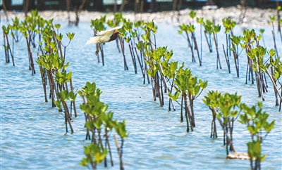 7月15日,万宁小海,一只鹭鸟在红树林中展翅飞翔。近年来,万宁通过退塘还海、修复红树林、实施“活海”工程、治理片区污水等举措,以综合治理方式系统化解决小海水生态环境问题,当地生态环境明显改善。本报记者 袁琛 摄