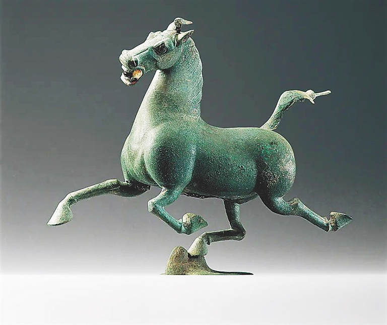最近,“马踏飞燕”的玩偶因其丑萌的外形火出了圈,其创意取自甘肃博物馆的青铜国宝——东汉铜奔马。1969年,甘肃武威新鲜人民公社的村民在挖防空洞时,无意间发现了一座埋藏有大量青铜车马仪仗俑的古墓,从随葬的五铢钱等遗物来看,这是一座东汉末期(一说魏晋时期)的张姓将军墓,后被称作雷台汉墓。出土的99件铜车马仪仗俑中,有一匹特立独行的骏马,它身无鞍鞯,四蹄翻飞;恰巧一飞鸟从其身旁如箭掠过,马蹄走云乘风,竟踏上鸟身。这件静态的青铜艺术品表现出了马踏飞鸟时刹那的动态之美,是铸铜技术与雕塑工艺相融合的珍品。