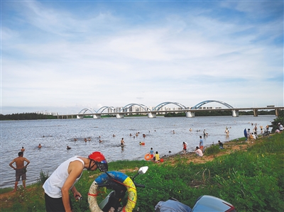 “这处水域底部是细沙,较为平坦,所以成为周边居民野泳的首选地。”经常来此游泳的陈女士介绍,该野泳点靠近江中心的区域,水深有三四米,水流湍急。