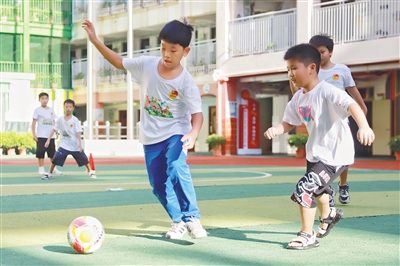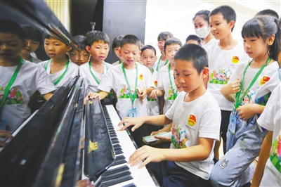 7月18日,三亚市第七小学,小朋友们在弹钢琴、踢足球。