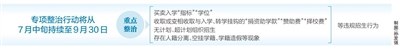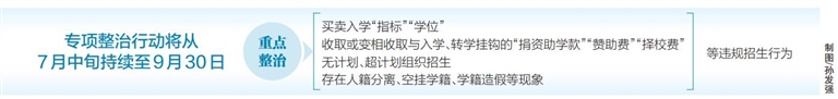 据悉,专项整治行动将从7月中旬持续至9月30日。重点治理以下10种中小学违规招生行为:买卖所谓入学“指标”“学位”,为违规择校提供便利;收取或变相收取与入学、转学挂钩的“捐资助学款”“赞助费”“择校费”等,以及跨学期收取学费;无计划、超计划组织招生,违规跨区域、跨省进行招生宣传和招生;存在人籍分离、空挂学籍、学籍造假等现象,为违规跨区域招收的学生和违规转学学生办理学籍转接;义务教育阶段学校以各种名义组织考试、掐尖或变相掐尖招生;义务教育阶段学校以学生考试成绩、各类竞赛证书、学科竞赛成绩、考级证明或社会培训机构组织的各类考试结果等作为招生入学和分班依据;以高额物质奖励、虚假宣传等不正当手段招揽生源;义务教育学校未实行均衡分班,设立任何名义的重点班、实验班、快慢班;义务教育学校对学生进行学科考试成绩排名、中考成绩排名、宣传中考状元和升学率,以及普通高中宣传、炒作高考状元;民办学校招生未纳入所在地统一管理,未与公办学校同步招生,或未经教育行政部门审批超范围招生;民办普通高中学校与考生违规签订提前录取协议。