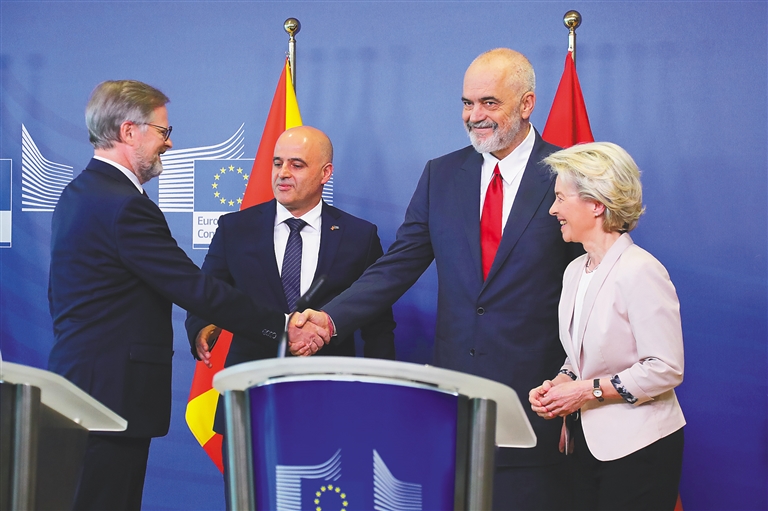 在推迟了近两年后,欧盟19日正式与阿尔巴尼亚和北马其顿开启入盟谈判。新华社记者 郑焕松 摄