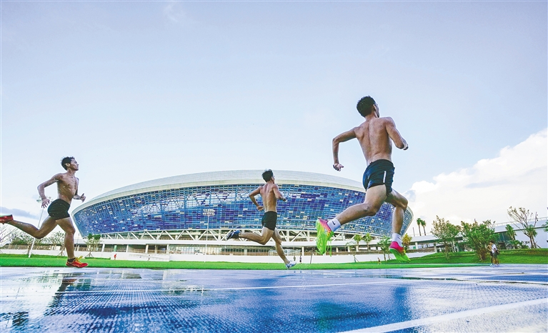 田径运动员在进行体能训练。7月20日,在儋州市体育中心“一场两馆”,运动员进行训练,积极备战省运会。本报记者 陈元才 摄