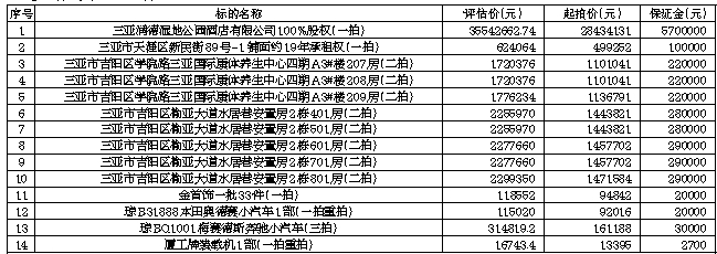 详细内容可关注“海南长江拍卖有限公司”微信公众号并进入→下方“罚没黑财”→点击可选分项→进入分项标的介绍→拉到底部点击“阅读原文”→进入平台电子竞价页面;也可直接进入阿里首页搜索:海南长江拍卖公司——进入查看。