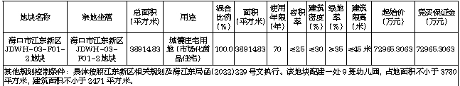 (一)挂牌成交后,土地竞买保证金自动转作为出让地块的土地出让金,土地出让金按《国有建设用地使用权出让合同》的约定支付。合同定金为成交价的10%。(二)竞买人竞得土地后,应当与挂牌人签订《挂牌成交确认书》,并在5个工作日内与挂牌人签订《国有建设用地使用权出让合同》,在签订《国有建设用地使用权出让合同》之日起15日内一次性付清全部土地出让价款。(三)本次挂牌宗地用于市场化商品住宅项目。(四)本宗地按现状出让。(五)该宗地项目根据《海南省商品住宅全装修管理办法(试行)》的规定采用全装修方式交房,并采用装配式方式建造,具体按照我省装配式建筑有关规定及市住建局具体要求执行。同时,该宗地拟建项目应按海口江东新区管理局要求实行绿色低碳建设,具体生态低碳指标详见该宗地产业发展和用地准入协议所附的“海口江东新区地块生态低碳指标”和“设计导则”。(六)本项目按《商品房销售管理办法》(原建设部令第88号),执行现房销售制度。(七)该地块配建一处 9 班幼儿园, 占地面积不小于 3780 平方米, 建筑面积不小于 2471 平方米。幼儿园设施应与首期建设项目同步建设,同步验收,竣工验收合格后无偿移交美兰区政府。(八)土地竞得人应于签订《国有土地使用权出让合同》后 1 个月内按照海口江东新区管理局规划和审批部门要求完成建筑概念性比选方案初稿编制送审。(九)本宗地拟建项目应于开工后3个月内开始基础底板施工,6个月内整体出±0.000,12 个月内主体结构封顶,18个月内完成装修。(十)竞得土地后1个月内,土地竞得人应完成项目推进专班或专业推进团队的组建,项目推进专班/团队应在海口有固定的办公地点,并派驻至少一名专职高级项目经理。 (十一)项目投入使用时,本宗土地在约定达产时间内的固定资产投资总额不低于29186.13万元人民币(用地投资强度不低于500万元/亩,不含土地价款及有关税费),以上控制指标按规定列入《产业项目发展和用地准入协议》,属于协议内容的组成部分。土地竞买人在竞得土地后5个工作日内须与海口江东新区管理局签订《产业项目发展和用地准入协议》,并严格按照《产业项目发展和用地准入协议》约定内容进行开发建设,否则将承担相关违约责任。(十二)本次挂牌出让国有建设用地已具备开发建设条件。竞得人应在按现状交地后3个月内动工,动工后18个月内完成项目建设。竣工6个月内投入使用。涉及水务、绿化、市容、卫生、环境保护、消防安全、交通管理等的设计施工,应符合国家、海南省和海口市的有关管理规定。(十三)税金由竞得人按税法规定交纳,挂牌交易服务费按规定收取。(十四)受让人凭土地出让金发票及完税证明等材料办理土地登记手续。
