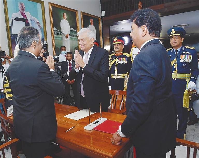7月21日,斯里兰卡新一任总统维克拉马辛哈(中)在科伦坡宣誓就职。
