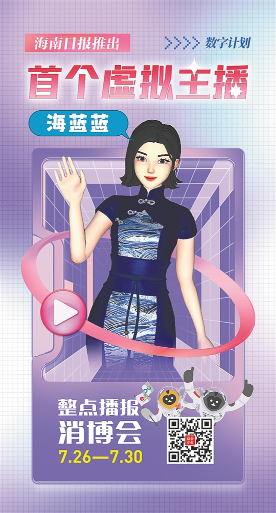 本报海口7月24日讯 (记者王丹南)海南日报首个虚拟数字主播“海蓝蓝”将在第二届消博会开幕当天正式上线。借助智能数字合成技术,“海蓝蓝”不仅颜值高,而且“专业”过硬,能够实时、全媒体播报新闻资讯。