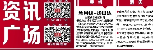 银达典当诚信经营23年,全国连锁分店25家,办理房产、汽车、名表、钻石、黄金、铂金、股票、数码产品及大宗房地产项目等典当贷款业务。正规专业、快速灵活、高额低息。海口公司:国贸玉沙路椰城大厦一层。电话:68541188、68541288、13307529219。三亚公司:三亚解放路第三市场旁,电话:88558868,13518885998。