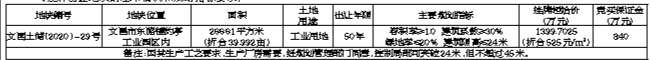 二、申请人资格: 中华人民共和国境内外的法人、自然人或其他组织(法律另有规定者除外)均可申请参加竞买(注:失信被执行人不得参与本次竞买),申请人应单独申请竞买。本次挂牌不接受联合体竞买,不接受竞买人电话、邮寄、电子、口头报价。申请人应具备的其他条件:(一)申请人须具备上述竞买条件,并按规定缴交土地竞买保证金,经过审核我局将在规定的时间内确认其资格,签发竞买资格确认书。(二)经政府相关部门核实,在文昌市境内申请人存在下列情形之一的,申请人及其控股股东禁止参加挂牌:1.存在伪造公文骗取用地和非法倒卖土地等犯罪行为的;2.存在非法转让土地使用权等违法行为的;3.因企业原因造成土地闲置一年以上的;4.开发建设企业违背出让合同约定条件开发利用土地的;5.拖欠土地出让金的。三、本次国有建设用地使用权挂牌出让设有底价,并按照出价高者且不低于底价者得的原则确定竞得人。四、本次挂牌出让的详细资料和具体要求,见挂牌出让文件。申请人可于2022年7月27日至2022年8月26日到海南省海口市国贸北路金融花园A座二层或文昌市自然资源和规划局三楼自然资源权益和开发利用室或海南省公共资源交易服务中心一楼受理大厅3号窗口咨询和购取挂牌出让手册,并按挂牌出让手册的具体要求报名参加竞买。五、申请人交纳竞买保证金的截止时间为2022年8月26日17:00(以竞买保证金到账为准)。经审核,申请人按规定交纳竞买保证金,具备申请条件的,我局将在2022年8月26日17:30前确认其竞买资格。六、本次国有建设用地使用权挂牌活动定于2022年8月19日8:30至2022年8月29日10:00在海南省政府会展楼二楼省公共资源交易服务中心土地交易厅进行。(2022年8月29日10:00在海南省政府会展楼二楼省公共资源交易服务中心土地交易厅召开挂牌现场会)。七、开发建设要求:(一)竞得土地后,竞得人须按照签订的《成交确认书》约定与文昌市自然资源和规划局签订《国有建设用地使用权出让合同》,按合同约定及时缴纳土地出让金。土地出让成交后,必须在20个工作日内签订出让合同,合同签订后30天内必须缴纳出让价款60%的首付款,须在出让合同生效之日起90日内付清全部土地出让金。合同约定分期支付国有建设用地使用权出让价款的,受让人在支付第二期及以后各期国有建设用地使用权出让价款时,同意按照支付第一期土地出让价款之日全国银行间同行拆借中心公布的贷款市场报价利率,向出让人支付利息。(二)本次出让宗地属工业项目用地。竞得该宗土地后,竞得人须在挂牌出让成交之日起二个月内完成项目规划设计方案,具备规划报建条件,并严格按照批准的项目规划设计方案要求,以及有关部门的行业规定,在签订出让合同之日起三个月内动工建设项目,一年半内完成项目的投资建设。不按批准的项目规划设计要求进行开发建设和不在三个月内动工建设项目的,由受让人向出让人支付相当于宗地出让价款1‰的违约金。取得土地超过一年未动工的,推送信用平台。受让人不履行《国有建设用地使用权出让合同》约定的,报经市政府批准后,按该合同约定,退还除该合同约定的定金以外的全部或部分国有建设用地使用权出让价款(不计利息),收回国有建设用地使用权;受让人造成土地闲置,按照《海南自由贸易港闲置土地处置若干规定》执行。(三)本次出让宗地按净地条件出让,即土地权利清晰、安置补偿落实到位、地上附着物清表、无法律经济纠纷、土地开发利用规划条件明确、符合土壤环境质量要求、符合海南省政府(琼府〔2018〕3号)文件规定具备动工开发所必需条件。竞买人应当现场踏勘出让地块,竞买人申请参加竞买的,视为对出让地块的净地条件无异议,在竞得土地后,竞得人须同意与出让人按该净地条件签订《国有建设用地交地确认书》确认出让地块交地开发建设。(四)按照《关于印发<海南省建设用地出让控制指标(试行)>的通知》(琼国土资规〔2018〕7号)和《关于实施产业项目发展和用地准入协议的指导意见》(琼国土资规〔2018〕8号)有关规定,本次出让宗地工业项目用地控制指标,投资强度为不低于 300 万元/亩,年均工业总产值为不低于350万元/亩,年均纳税额不低于30万元/亩,达产年限5年。以上控制指标按规定列入《产业项目发展和用地准入协议》,属于协议内容的组成部分,竞得人在签订国有土地使用权出让合同时,一并与文昌市科学技术工业信息化局签订《产业项目发展和用地准入协议》。(五)竞得土地后,竞得人拟在文昌注册成立新公司进行开发建设的,应在竞买申请书中明确新公司的出资构成、成立时间等内容。(六)竞得土地后,竞得人须按规定完善该宗地施工报建、地质、压覆矿、消防、环保、土壤等审批手续,方可动工建设。(七)根据《文昌市住房和城乡建设局关于文国土储〔2020〕-29号地块建设项目装配式建造意见的复函》,该地块的竞得方应采用装配式方式建造。八、其他需要公告的事项:(一)本次挂牌出让宗地设有底价,竞买人报价低于底价的,挂牌不成交。(二)本次挂牌服务费(佣金)由竞得人按照国家法律规定的收费标准,支付给代理挂牌中介服务机构。(三)挂牌时间截止时,有竞买人表示愿意继续竞价,转入现场竞价,通过现场竞价确定竞得人。(四)本次挂牌出让事项如有变更,届时以变更公告为准。(五)本公告未