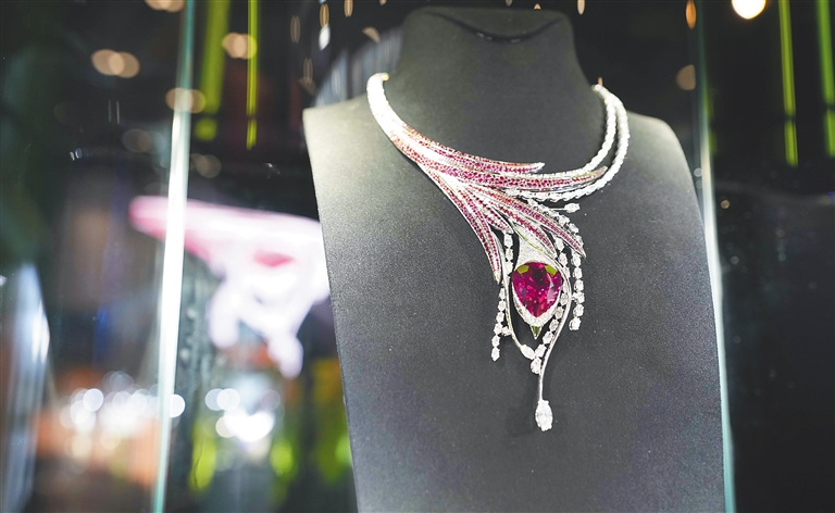 有些展品很养眼,有极高的艺术价值和审美情趣。比如,那件静静挂在模型脖子上的朱雀高级彩宝钻石项链,光彩照人,尽显迷人气质。