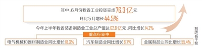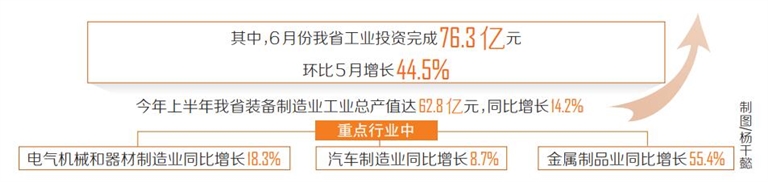 其中6月份我省工业投资完成76.3亿元,环比5月增长44.5%。省工信厅确定的111个工信产业项目上半年完成投资进度54.31%,快于序时进度4.3个百分点。