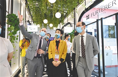法国馆的参展商向嘉宾介绍品牌展览情况。本报记者 王凯 摄
