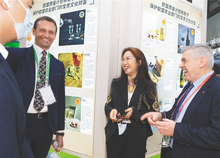 在消博会3号馆的欧盟地理标志展示馆,嘉宾开怀畅谈。本报记者 袁琛 摄