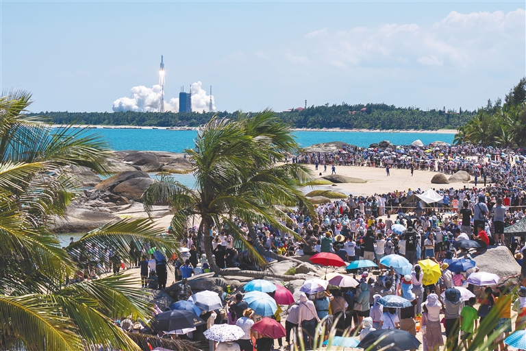 7月24日14时22分,搭载问天实验舱的长征五号B遥三运载火箭,在中国文昌航天发射场成功点火发射。当天,近50万名游客涌入火箭发射所在地文昌市龙楼镇,出现“一房难求”“一桌难订”的爆满情况。