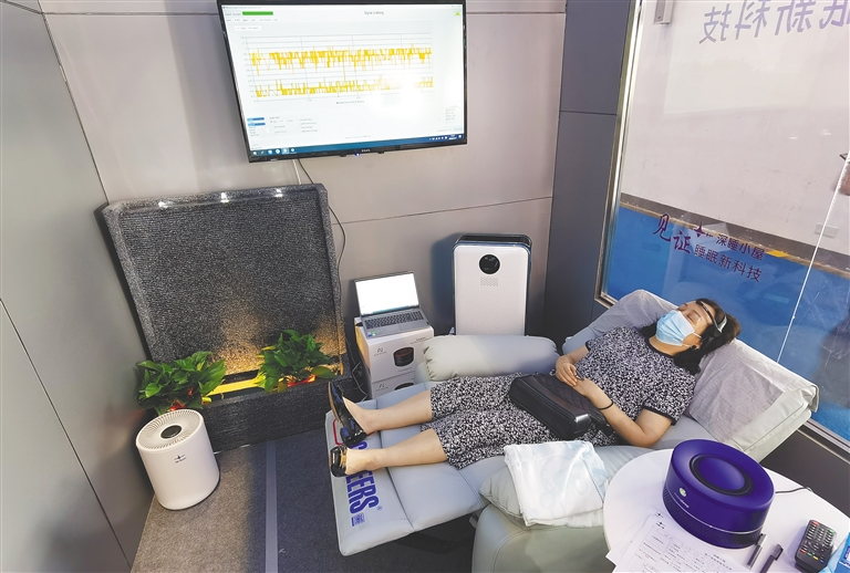 这间“深度睡眠小屋”由上海艾纳诗科技集团打造,屋子里有该集团的明星产品“慢波睡眠机”和“舒曼波康养机”。“我们的睡眠机可在人体内部营造睡眠微环境,触发人脑自发‘慢波’,能有效延长深度睡眠周期。康养机则是通过荷电粒子波调谐模块等关键核心技术,激活人体免疫系统。”该公司总经理滕树杰介绍,“深度睡眠小屋”为消费者提供的是一套系统性的睡眠生态。