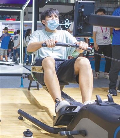 ③消博会一号馆,观众在玩仿真划船游戏。
