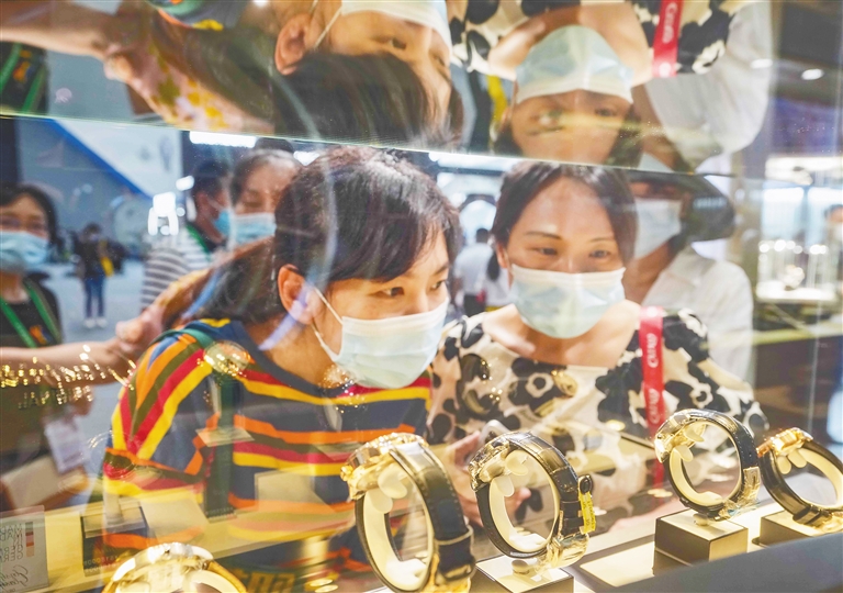 ②消博会五号馆,观众欣赏展柜里的手表。