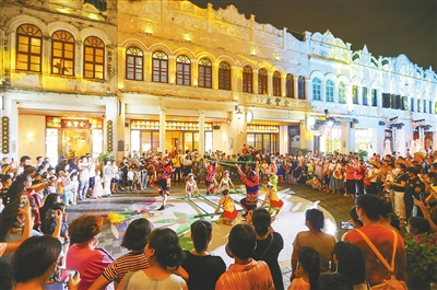 7月26日,海口龙华区在骑楼老街举办非遗特色展,表演者跳起打柴舞,吸引市民游客围观拍照。