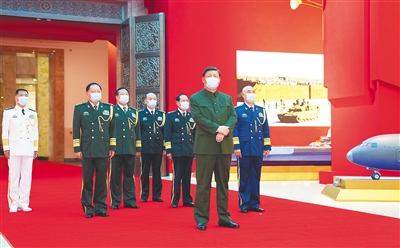 下午4时30分许,习近平来到中国人民革命军事博物馆,步入展厅参观展览。展览聚焦以习近平同志为核心的党中央领导国防和军队建设的伟大实践,安排8个单元展区,设置“党在新时代的强军目标”、“重整行装再出发”、“砺剑铸盾 奔向一流”、“大好河山 寸土不让”、“爱我人民爱我军”、“深情励三军 奋进新征程”等重点展项,通过1400余件文物实物、630余张照片、近百套武器装备模型以及大量图表、视频、艺术作品、互动项目等,生动展示了新时代国防和军队建设的壮阔历程和伟大成就,充分展现了人民军队忠诚维护核心、矢志奋斗强军的昂扬风貌。习近平不时驻足观看,认真听取讲解,询问有关情况。