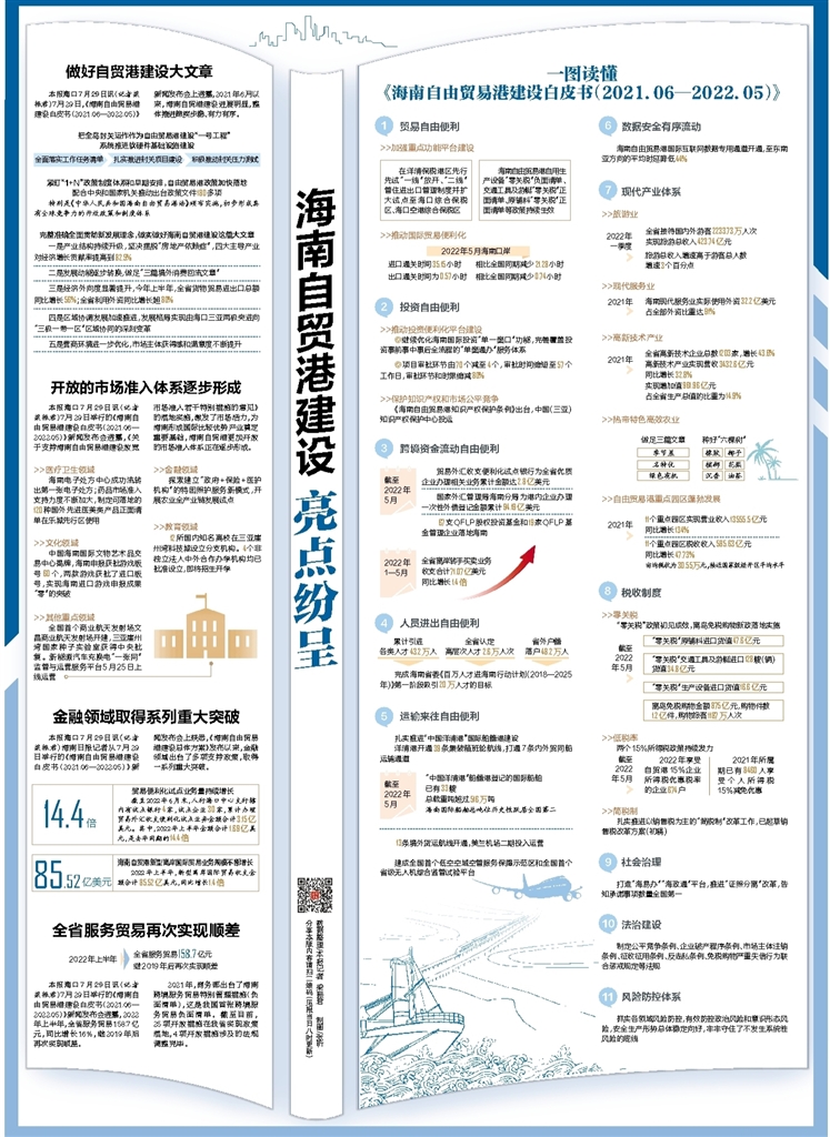 本报海口7月29日讯(记者梁振君)7月29日,《海南自由贸易港建设白皮书(2021.06—2022.05)》新闻发布会上透露,2021年6月以来,海南自贸港建设进展明显,整体推进蹄疾步稳、有力有序。