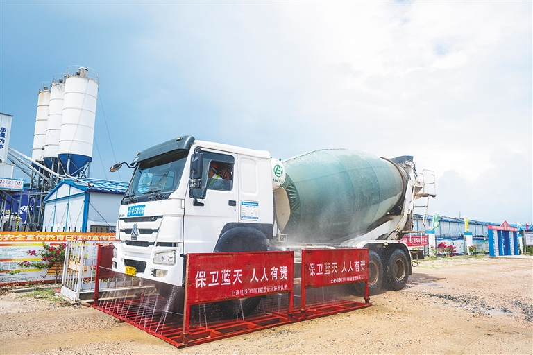 “不仅进搅拌站要洗,出去的时候也要洗,我们既要保持搅拌站的清洁,也不能让沾了大量泥沙的车直接驶上国省干道,污染路面。”中交四公局海南环岛旅游公路三工区项目党支部书记张福磊说,车辆在运输过程中还必须全程覆盖苫布,防止运输过程中扬尘污染周边环境。