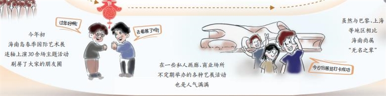 以年初的海南岛春季国际艺术展为例,《2022(首届)海南自贸港国际美术展》《韩美林生肖艺术展》《秘境生灵——四国摄影师镜头中的野性世界》等多个展览云集国内外艺术家佳作,一度刷屏春节假期“朋友圈”。