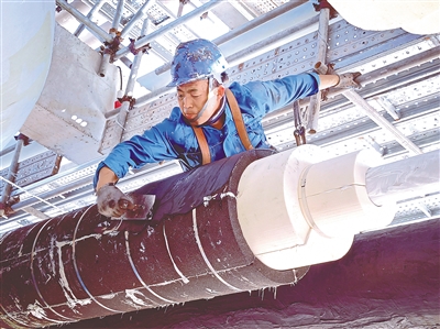 7月31日上午,在施工现场,工人们正在给低温工艺管道包扎一种泡沫状物。“这种材料叫泡沫玻璃,主要起到防火隔热、节能环保等作用。”郑益杰说,由于低温工艺管道的操作温度低于正常环境温度,为减少管道在输送过程中冷量损失、降低能耗、介质升温,以便于系统的良好运行等原因,在施工时需要给低温管道做好防锈防腐处理外,还给他们“穿”上“隔热外衣”。而且,不同的工艺管道其“隔热外衣”的层数、总厚度也不一样。