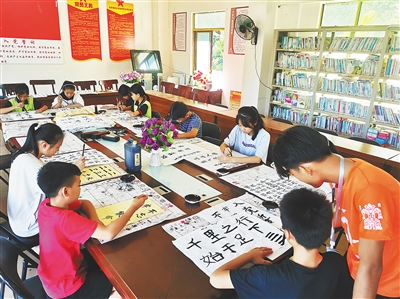 “写毛笔字,坐姿很关键,大家端坐时腰身挺直,两只脚要自然放平,也不能交叉、蜷腿……”南开村阅览室临时布置的书法培训室里,10多名学龄儿童端坐在长桌旁,一张张书法练习纸平铺桌面上,一支支毛笔握在手中,一双双稚嫩又好奇的眼睛紧盯同一个方向——返乡大学生杨凡正在讲解毛笔正楷笔画的注意事项。