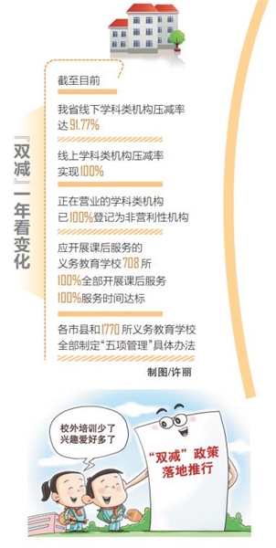 省教育厅提供的数据显示,截至目前,我省线下学科类机构压减率达91.77%,线上学科类机构压减率100%,正在营业的学科类机构已100%登记为非营利性机构;