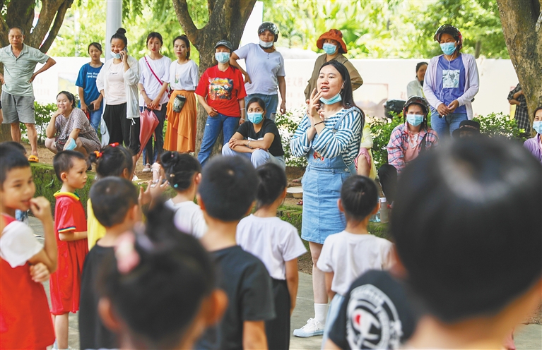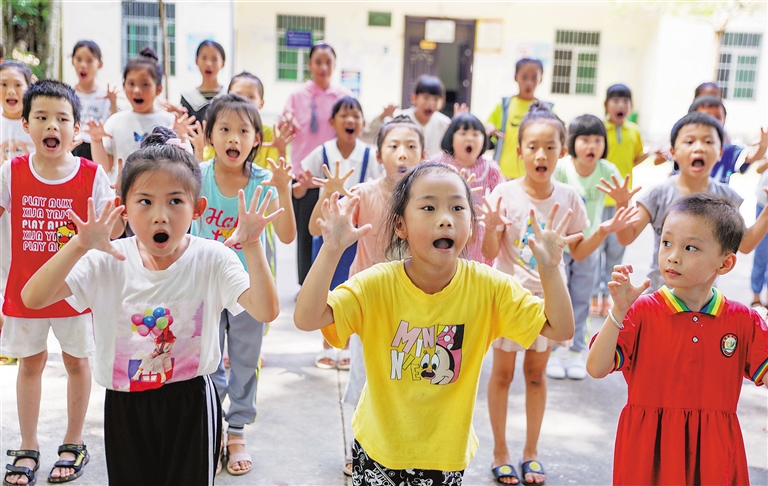 近日,五指山市毛阳镇小学生在公益课上学习口部操。为丰富中小学生的暑期生活,五指山市文化馆近期组织老师到各乡镇开展朗诵、竹木器乐等公益课程。本报记者 李天平 摄