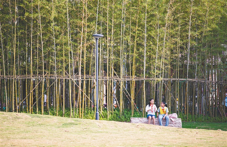 一边是绿竹入幽径,一边是闹市车马喧。位于海口市龙华区解放西路竹林村的口袋公园与金棕榈商城仅一路之隔,是藏匿于闹市之中的一片静谧之地。有些人或许路过解放西路很多次,但却未曾到这片城中小绿洲来逛逛。