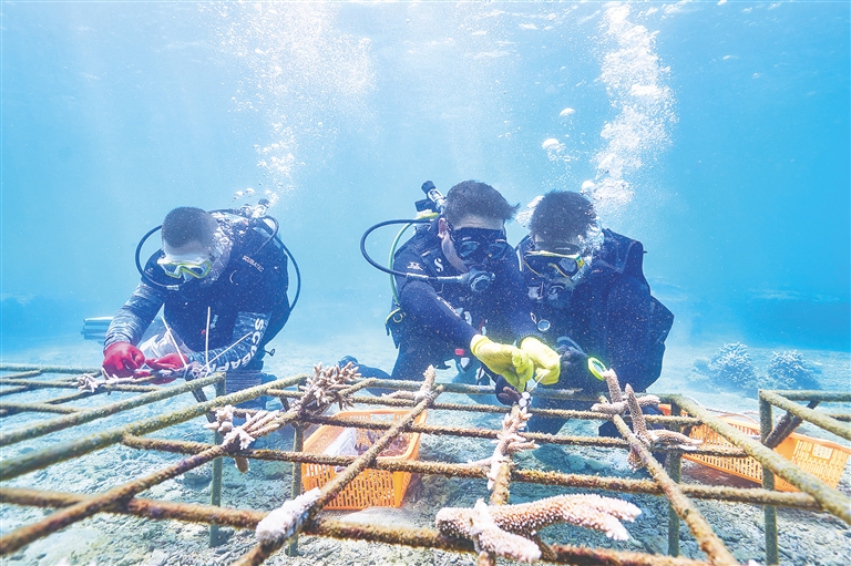 8月3日,参加2022年陵水潜水节的嘉宾在分界洲岛附近海域进行海底珊瑚移植与观摩。2022年陵水潜水节当天在分界洲岛旅游区启动,活动以“畅潜蔚蓝,探索起源”为主题,开展潜水摄影展、潜水行业交流会、海底珊瑚移植与观摩、净滩换礼、海底寻宝等丰富多彩的主题活动。本报记者 武威 摄