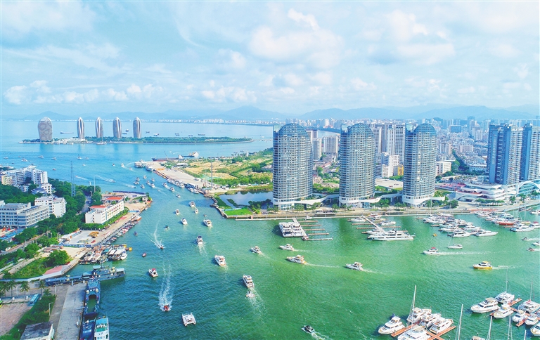 在三亚河入海口,一艘艘游艇出港。丰富多彩的游艇出海游产品和水上项目,当前正成为三亚新的旅游消费热点。见习记者 王程龙 摄