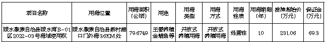 根据《中华人民共和国海域使用管理法》《海南省实施<中华人民共和国海域使用管理法>办法》和《海南省海域使用权审批出让管理办法》及有关法律法规规定,经陵水黎族自治县人民政府批准,陵水黎族自治县行政审批服务局决定以挂牌方式公开出让陵水黎族自治县陵水湾B-01区2022-03号海域使用权。现将有关事项公告如下: