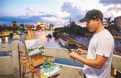 8月2日傍晚,绘画爱好者用画笔记录海甸溪的晚霞风光。约7公里长的海口湾畅通工程二期沿着海甸溪南北两岸分布,优质的滨水公共开放空间和多样化的公共服务设施,已经成为市民游客休闲的好去处。本报记者 李天平 摄