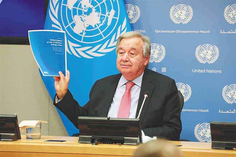 8月3日,在位于纽约的联合国总部,联合国秘书长古特雷斯出席联合国全球粮食、能源和金融危机应对小组第三次报告发布会。