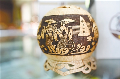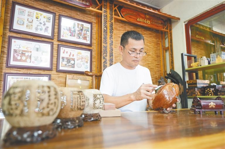 “在当时‘黑漆漆’的椰雕工艺品中,这款色彩明亮的‘熊头’突出重围,受到市场的认可。一家旅行社一下子预订了300个,我们连续一个星期加班加点完成,赚取了‘第一桶金’。”余贤栋说,这也给了他信心,更加坚定要设计出与众不同的作品。
