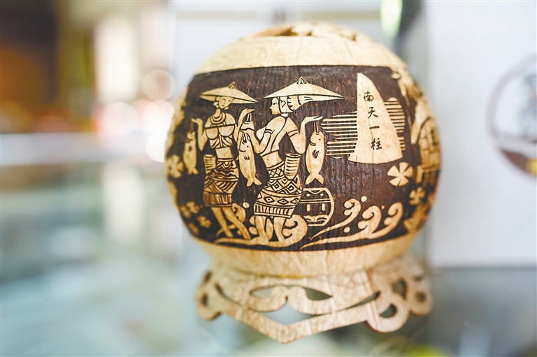 “这样的椰雕工艺品,年轻人会喜欢吗?”在椰雕厂里,余贤栋看到的工艺品,色彩偏黑,多为深棕色,制作上只是简单地打磨,再配上简约的图案。“年轻人追求新颖和独特,喜欢明亮的色彩。也许我可以朝这个方向努力。”余贤栋在心里定下了目标。