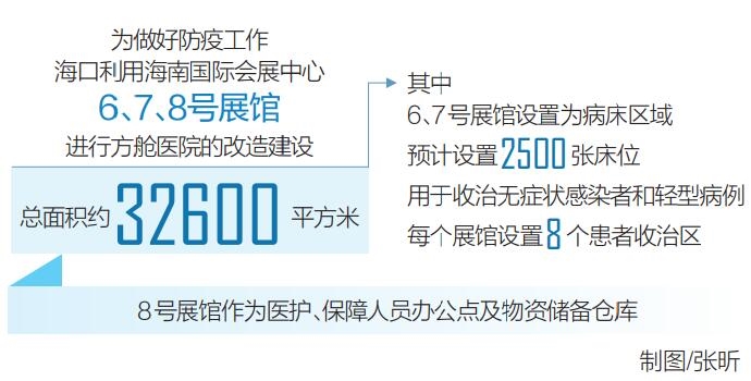 发布会介绍,为做好防疫工作,海口利用海南国际会展中心6、7、8号展馆进行方舱医院的改造建设,总面积约32600平方米。其中,6、7号展馆设置为病床区域,预计设置2500张床位,用于收治无症状感染者和轻型病例,每个展馆设置8个患者收治区。8号展馆作为医护、保障人员办公点及物资储备仓库。