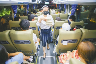 游客陆续上车后,酒店工作人员拿着面包等点心,上车分发给游客。