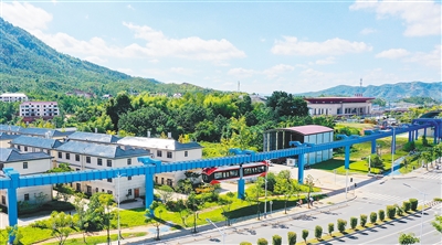 当日9时30分,一组红白相间的空轨列车悬浮在蓝色轨道下方,在当地群众的注视下,缓缓驶出兴国县永丰站,沿站前大道东侧绿化带,一路向北至静调库,全线用时约4分钟。