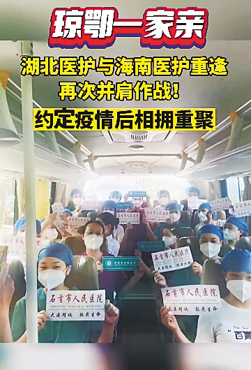 2020年,湖北疫情告急,海南共派出7批865人医疗队支援湖北。如今,海南疫情持续,湖北1500余名医护人员来琼驰援。2年前曾在抗疫战场上并肩作战的琼鄂两地医护人员,此刻再次携手战疫。